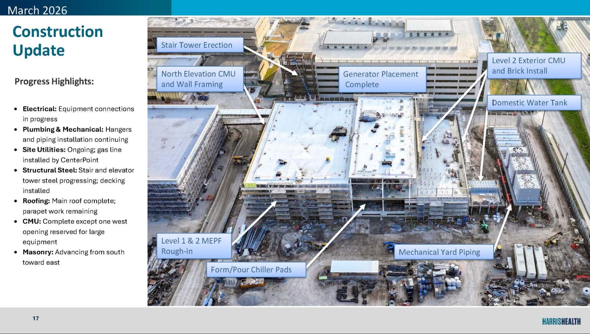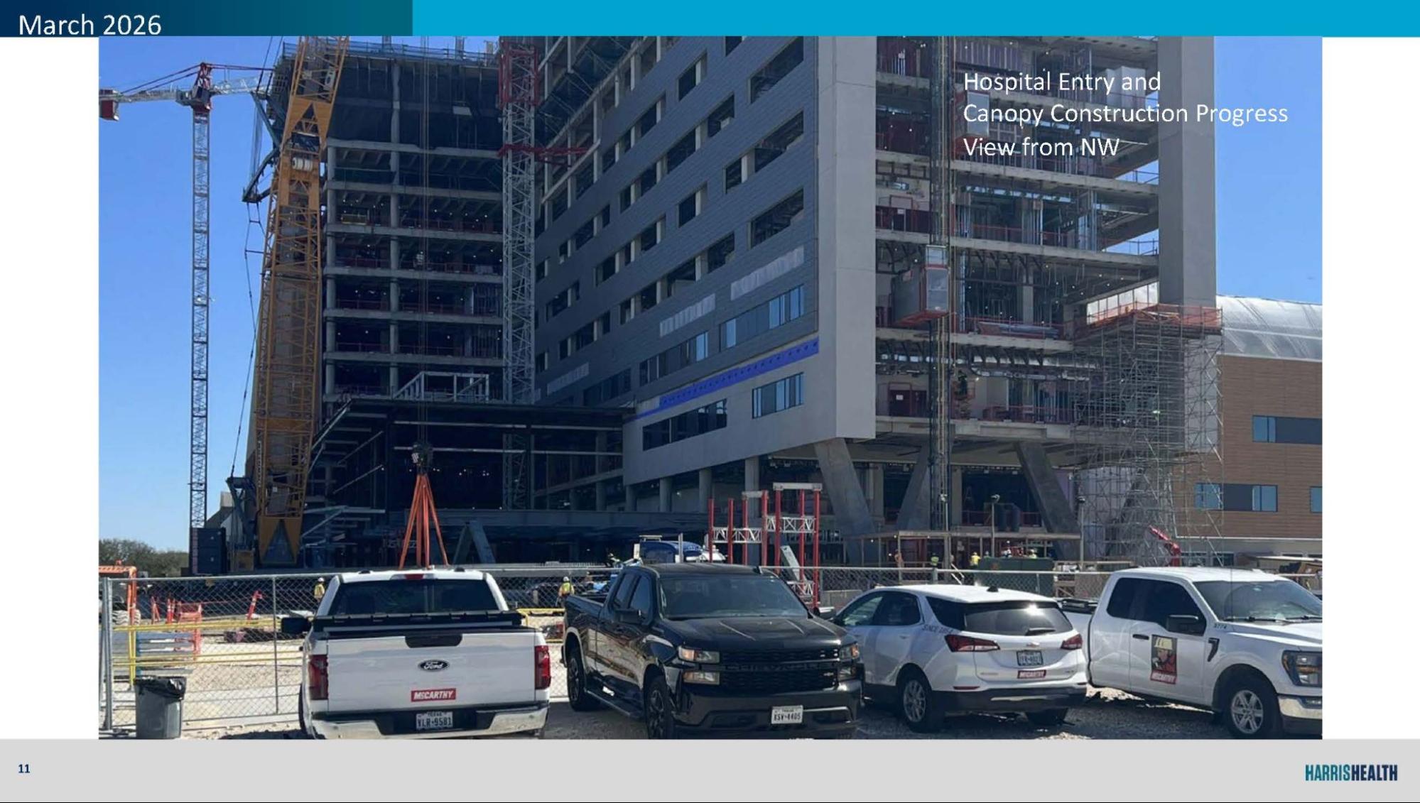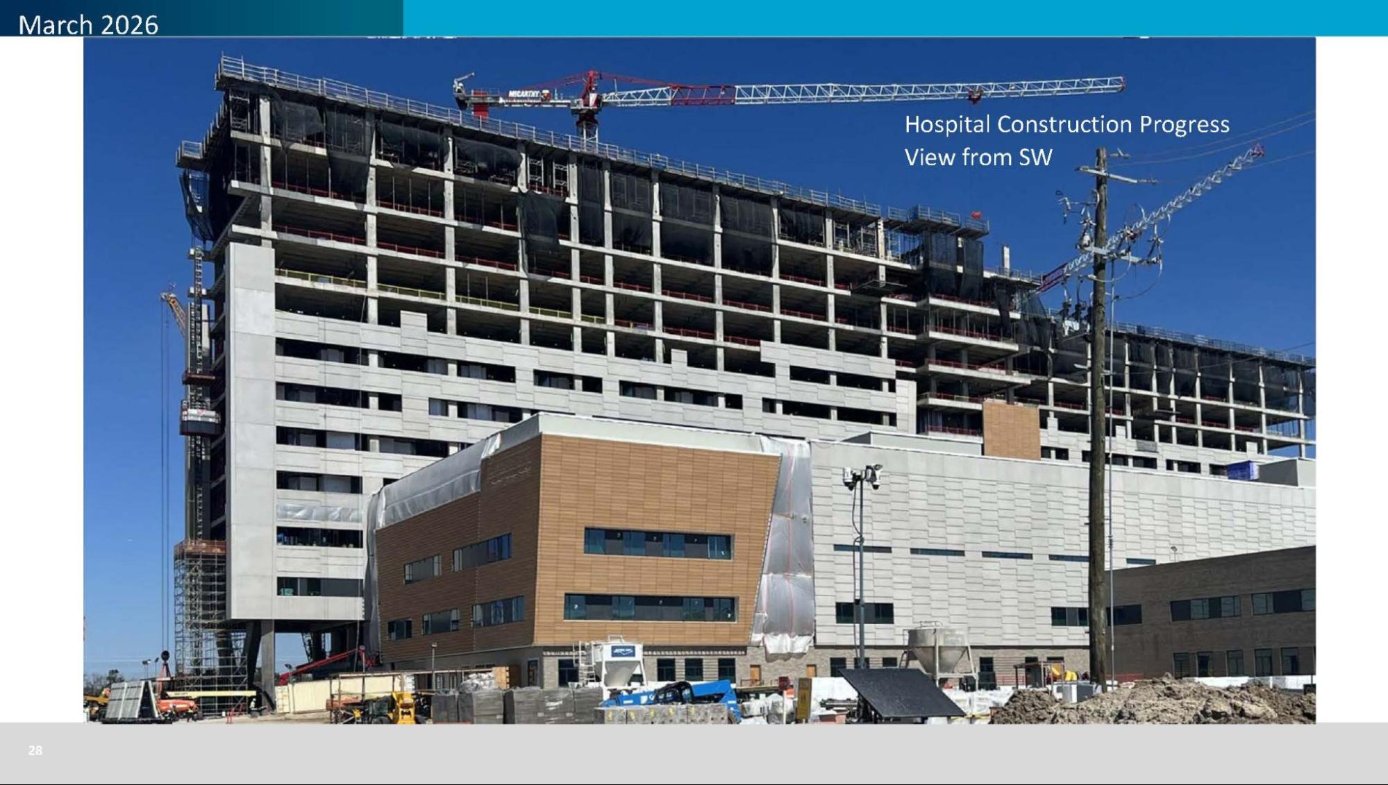 The schedule remains aligned with major milestones, including substantial completion in 2028 and first patient in early 2029. The team continues to coordinate closely with vendors, utilities, and clinical partners to maintain readiness for upcoming equipment installations and commissioning activities.