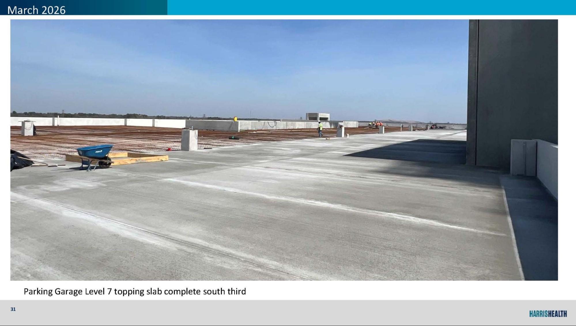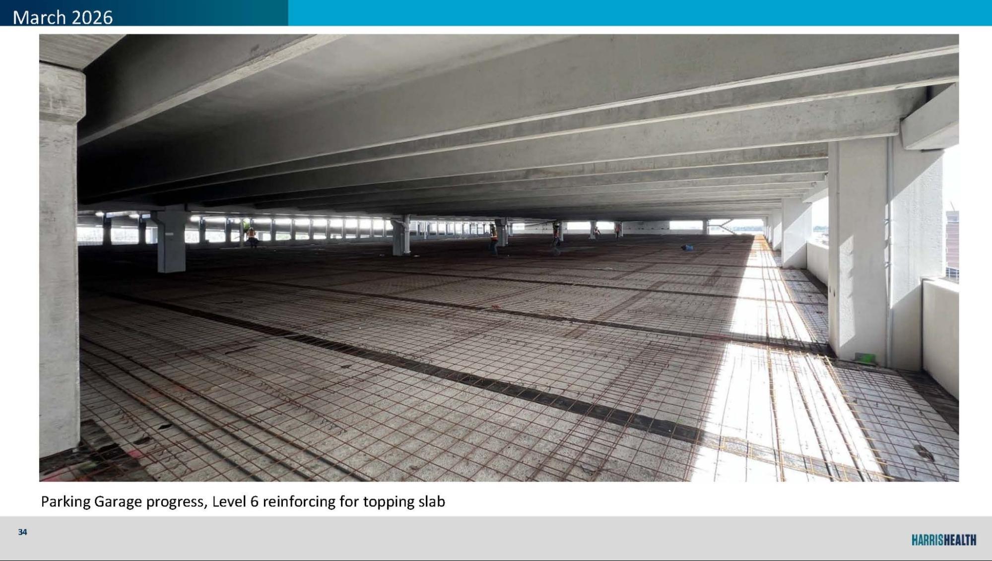 Visitor Garage topping slabs underway, with Level 7 south third complete and reinforcing in progress on Level 6.