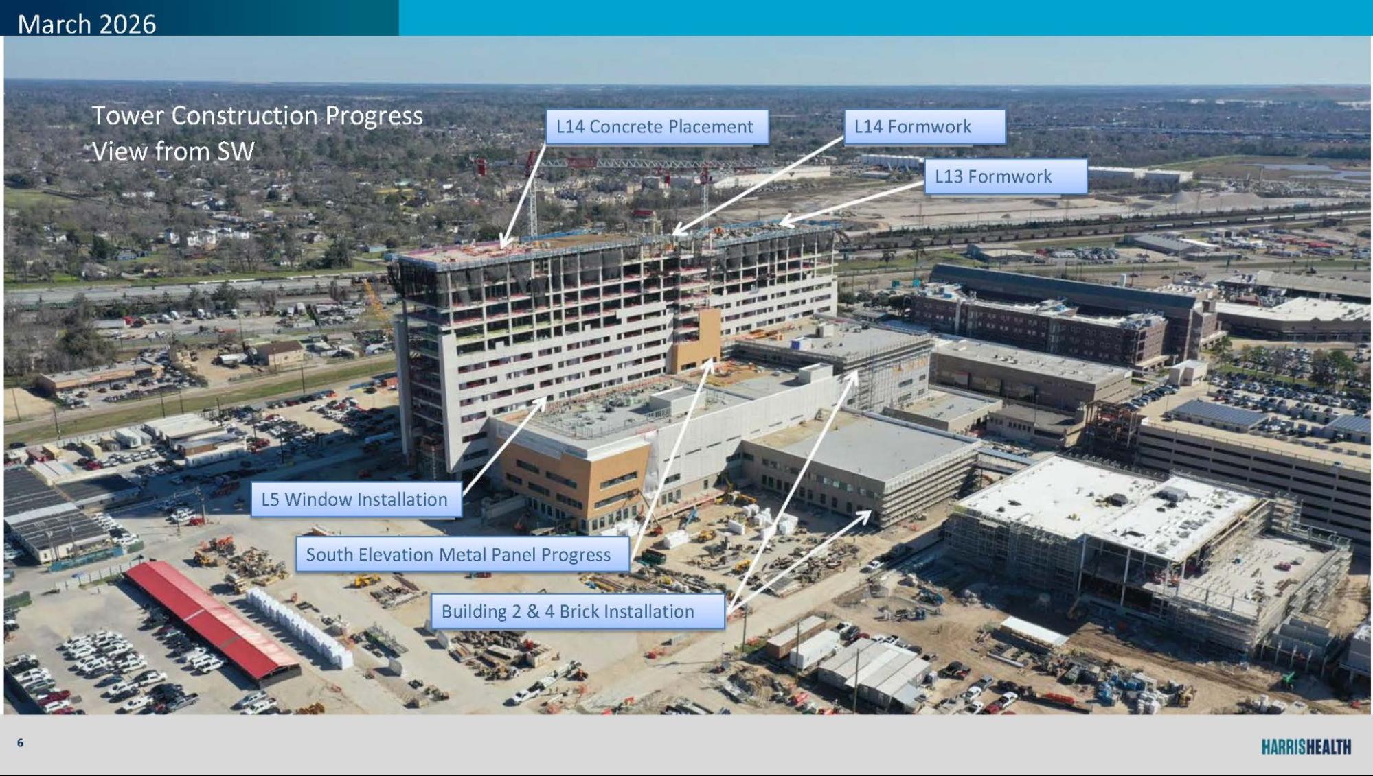 Tower construction is advancing with Level 14 concrete placement, ongoing window installation, and exterior precast, brick, and metal panel work.
