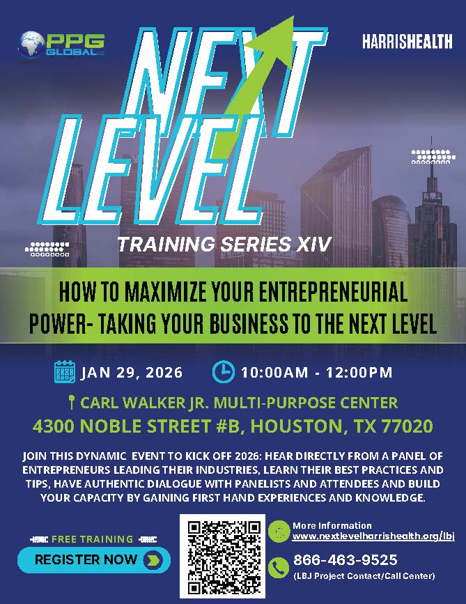 | 1/29/2026 Wednesday | Next Level Training Series XIV – How to Maximize Your Entrepreneurial Power: Taking Your Business to the Next Level | Carl Walker Jr. Multipurpose Center 4300 Noble St. B Houston, TX 77020 |