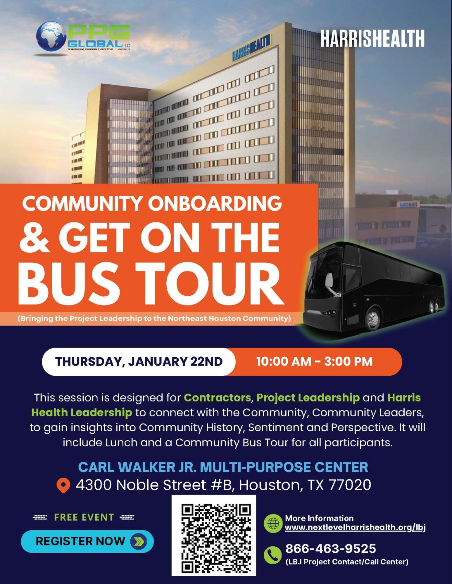 | 1/22/2026 Thursday | Community Onboarding & Get On the Bus Tour | Carl Walker Jr. Multipurpose Center 4300 Noble St. B Houston, TX 77020 |