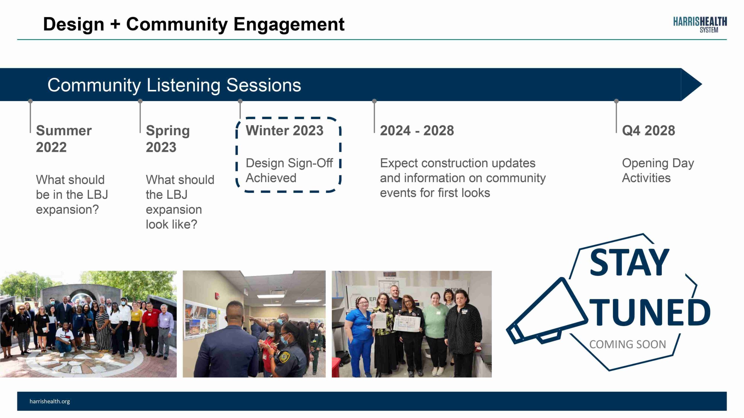 As we begin planning the new LBJ Hospital campus, Harris Health and our project partners are committed to engaging the local community and our staff to ensure that we meet the needs and expectations for their new healthcare home.