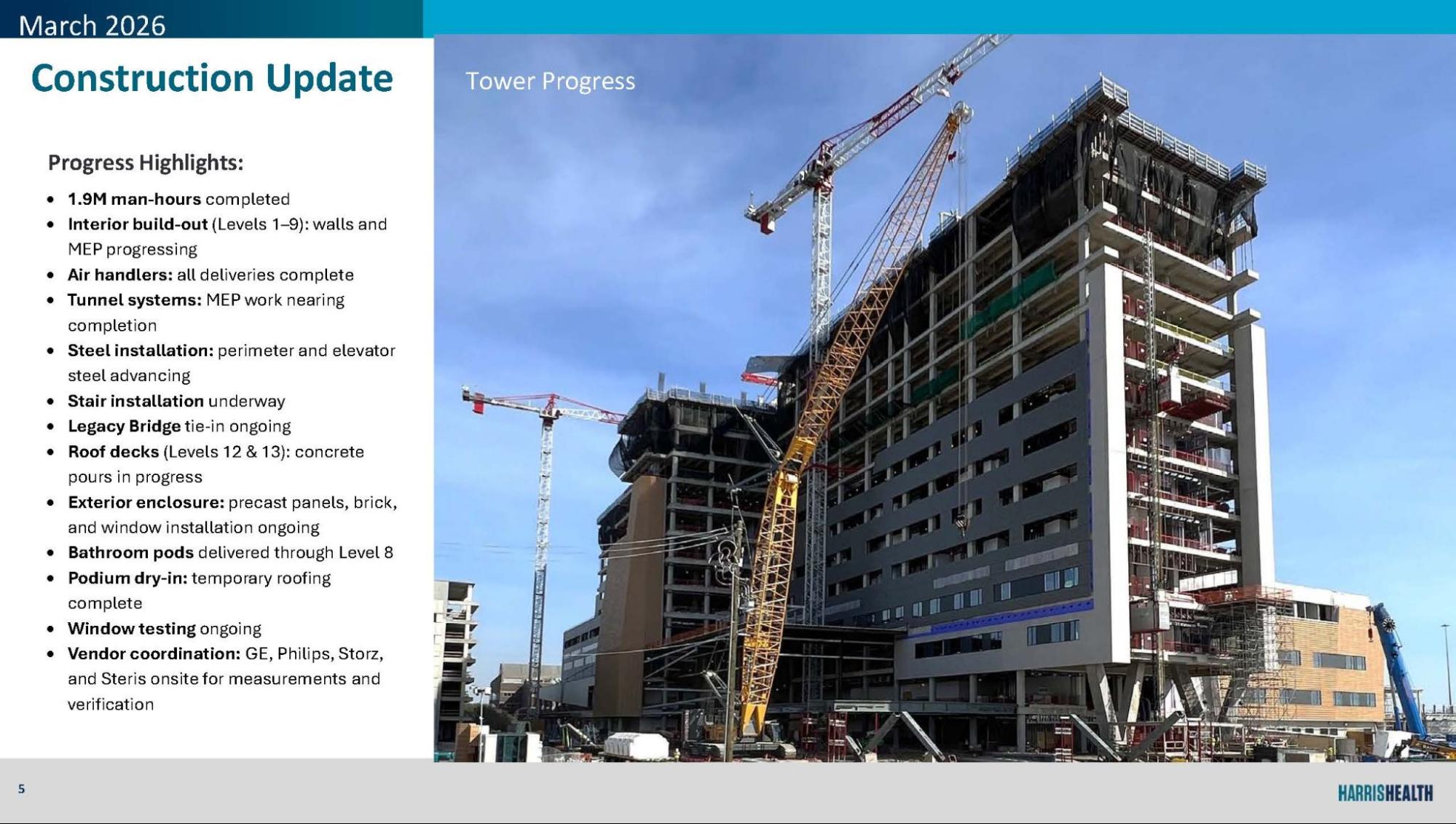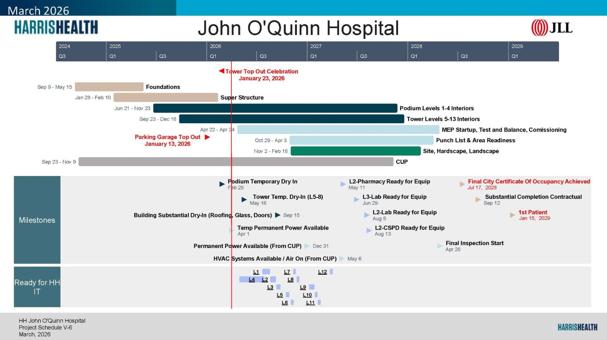 The schedule remains aligned with major milestones, including substantial completion in 2028 and first patient in early 2029. The team continues to coordinate closely with vendors, utilities, and clinical partners to maintain readiness for upcoming equipment installations and commissioning activities.