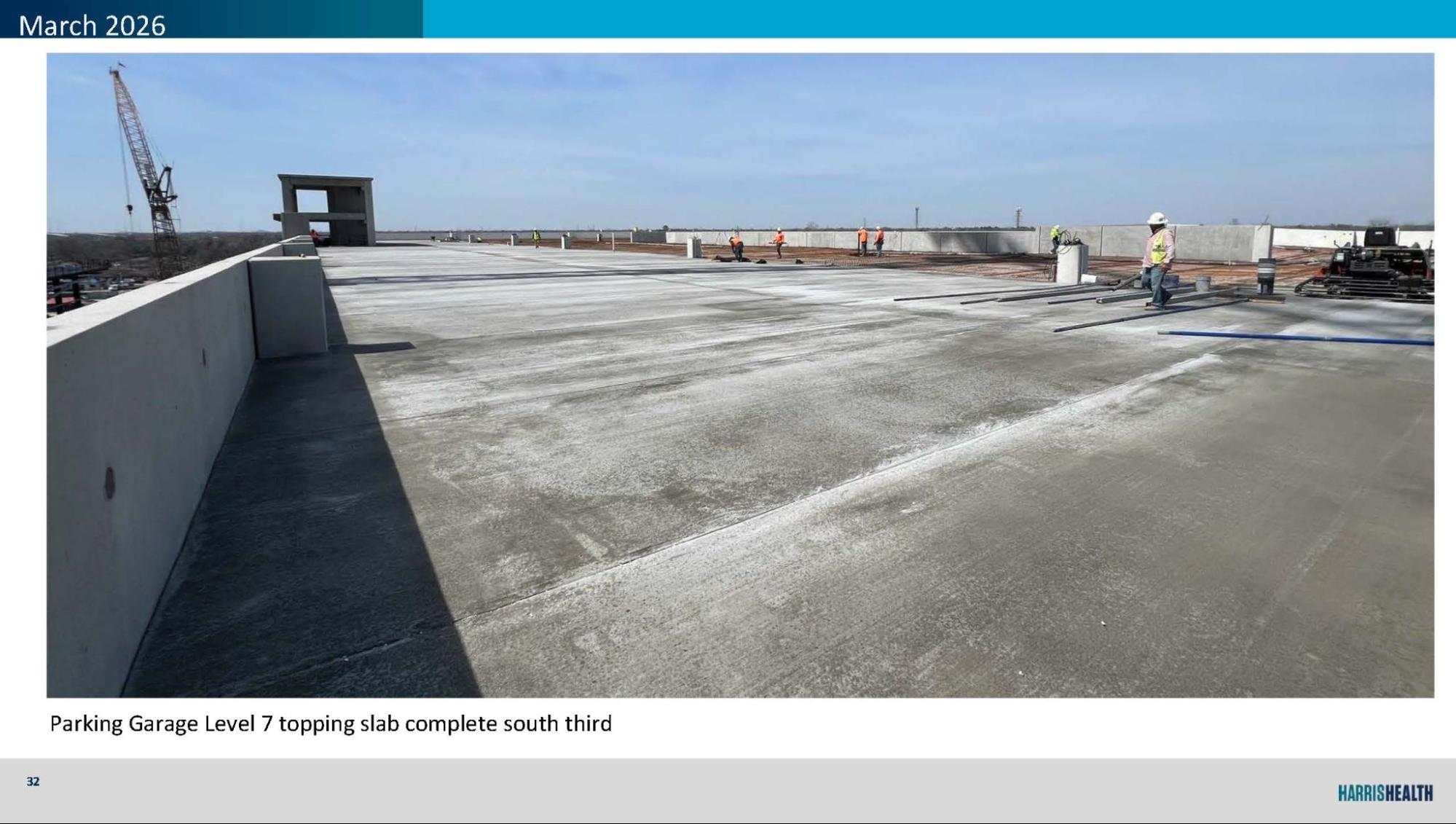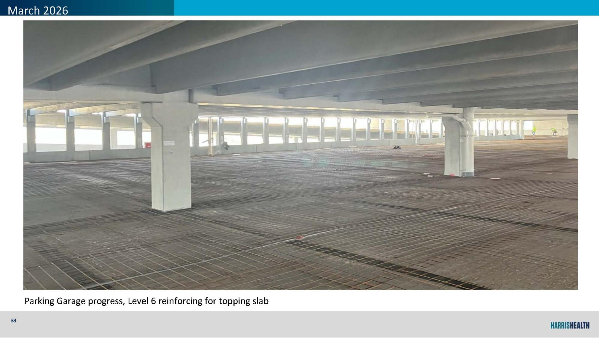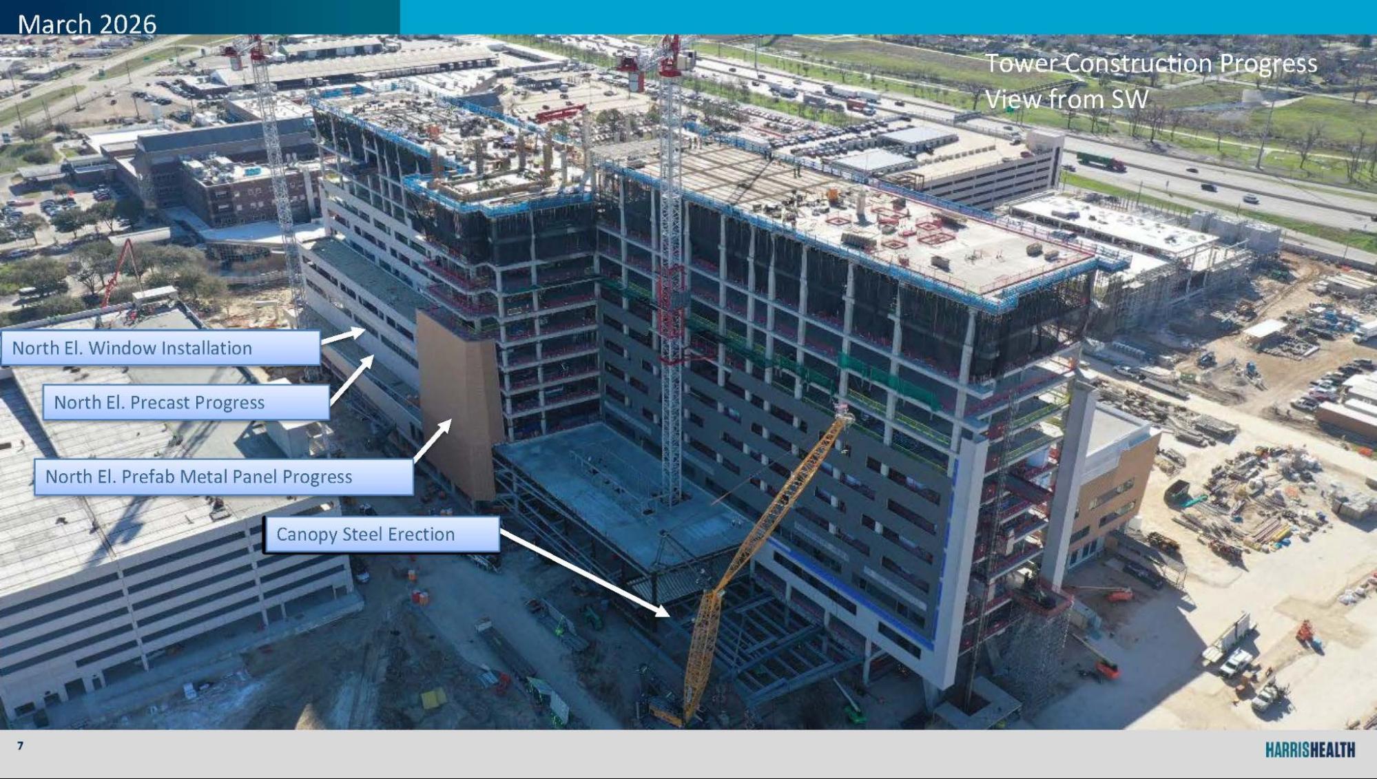 Visitor Garage topping slabs underway, with Level 7 south third complete and reinforcing in progress on Level 6.