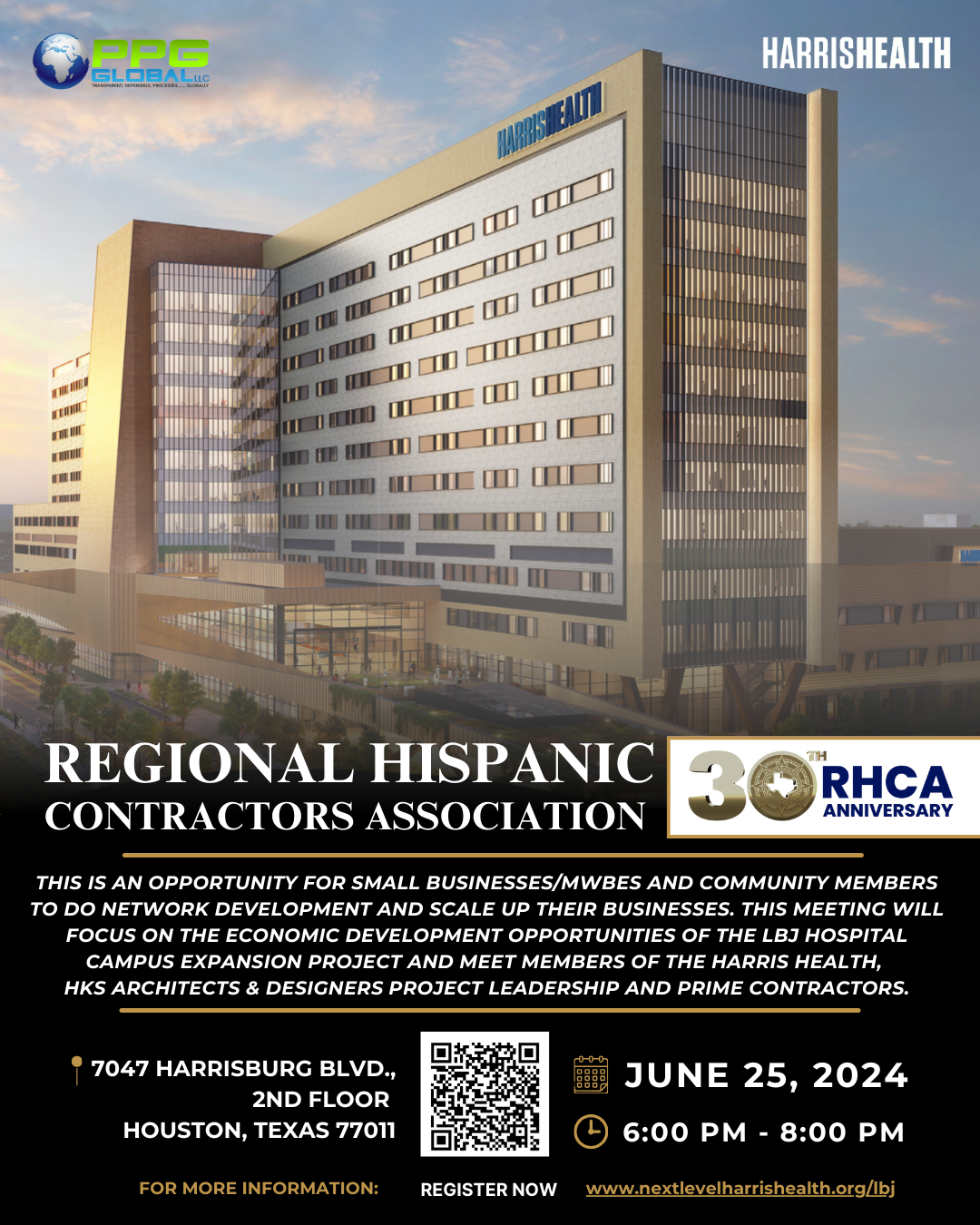 | 6/25/2024 | Regional Hispanic Contractors Association- PPG Global & Harris Health Contractor Diversity –MWBE Collaboration Meeting | Regional Hispanic Contractors Association 7047 Harrisburg Blvd-2nd Floor Houston, TX 77011 | 6:00pm-8:00pm | This is an opportunity for small businesses/MWBEs and community members to do some network development and to scale up their business. This meeting will focus on the economic development |