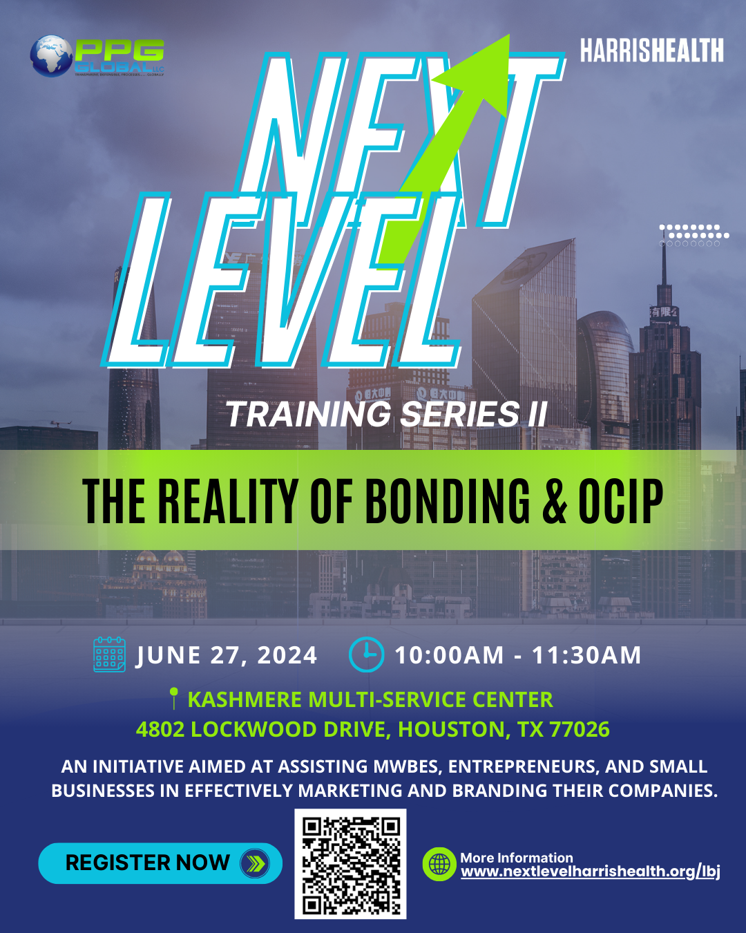 | 6/27/2024 | Next Level Training Series II- The Reality of Bonding & OCIP | Kashmere Gardens Multi-Service Center 4802 Lockwood Dr. Houston, TX 77026 | 10:00am-11:30am | Next Level Training Series is for MWBEs, entrepreneurs, small businesses, and those thinking about starting their own business or expanding it. These training series will help participants develop, retool and perfect their business skills to be successful as they pursue procurement opportunities or to expand their services, as it relates to the LBJ Hospital Project Opportunities. |