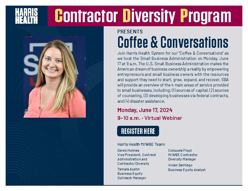 | 6/17/2024 | Coffee & Conversations- Presented by Harris Health Contractor Diversity Program | Registration Link: harrishealth.diversitycompliance.com/FrontEnd/EventView.asp?XID=980&TN=harrishealth&EID=4711EE98B2F0D3740C3C81A886C782B8CBE98F15D0E37EB0&BAB=787315AE95050E9787079D730FCAF009E69C805AF3028148 | 9:00am-10:00am | Sponsored by the Harris Health Contractor related to MWBE programs. There will be a presentation by SBA. Please register for this dynamic meeting Diversity Program. This is a virtual meeting covering a variety of topics with panel guests. |