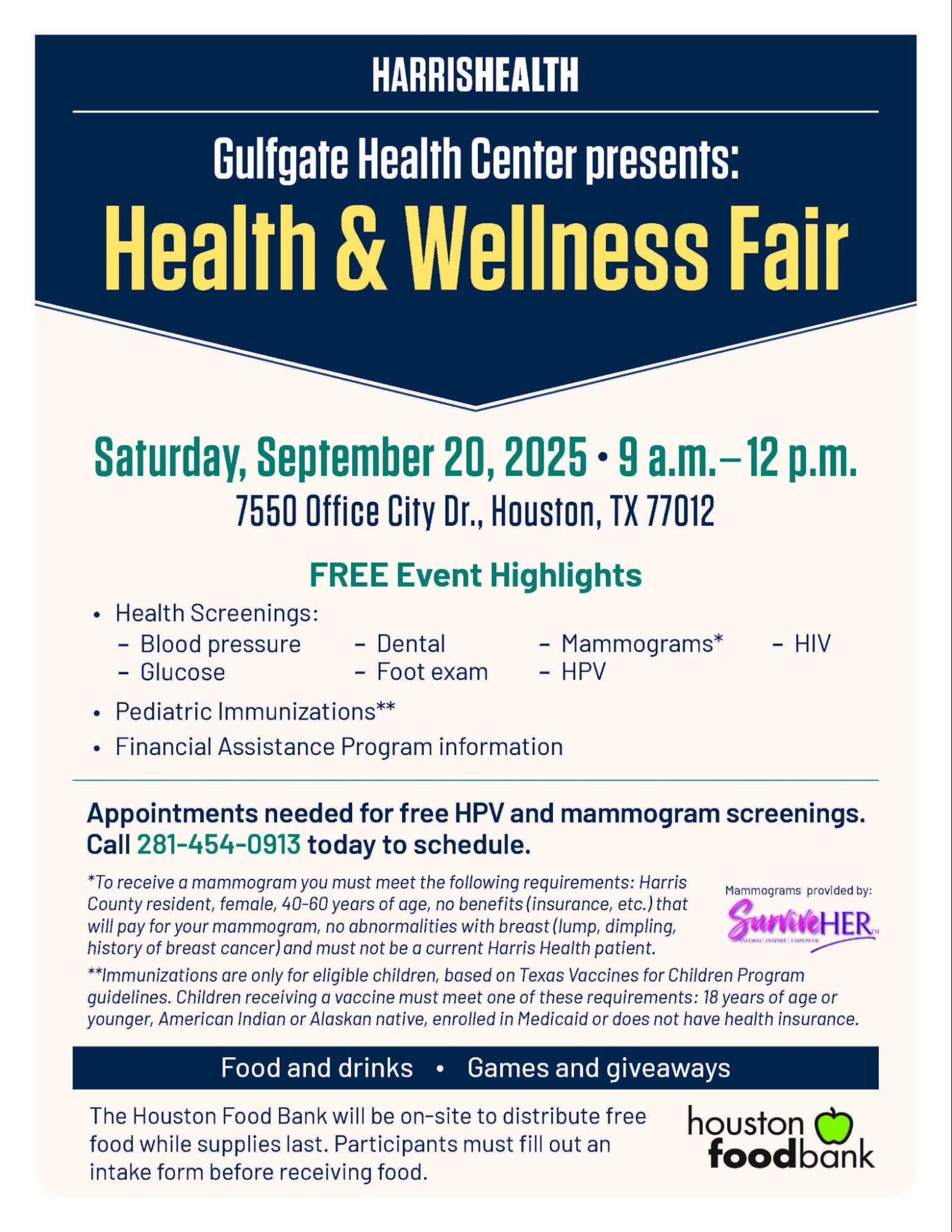 Sponsored by Harris Health and opened to the Public. Free Event – Health Screenings, Immunizations and Financial Assistance Information. Appointments needed for Mammograms – contact 281-454-0913. Houston Food Bank will be on site to distribute food while supplies last. See Flyer for Registration. |
