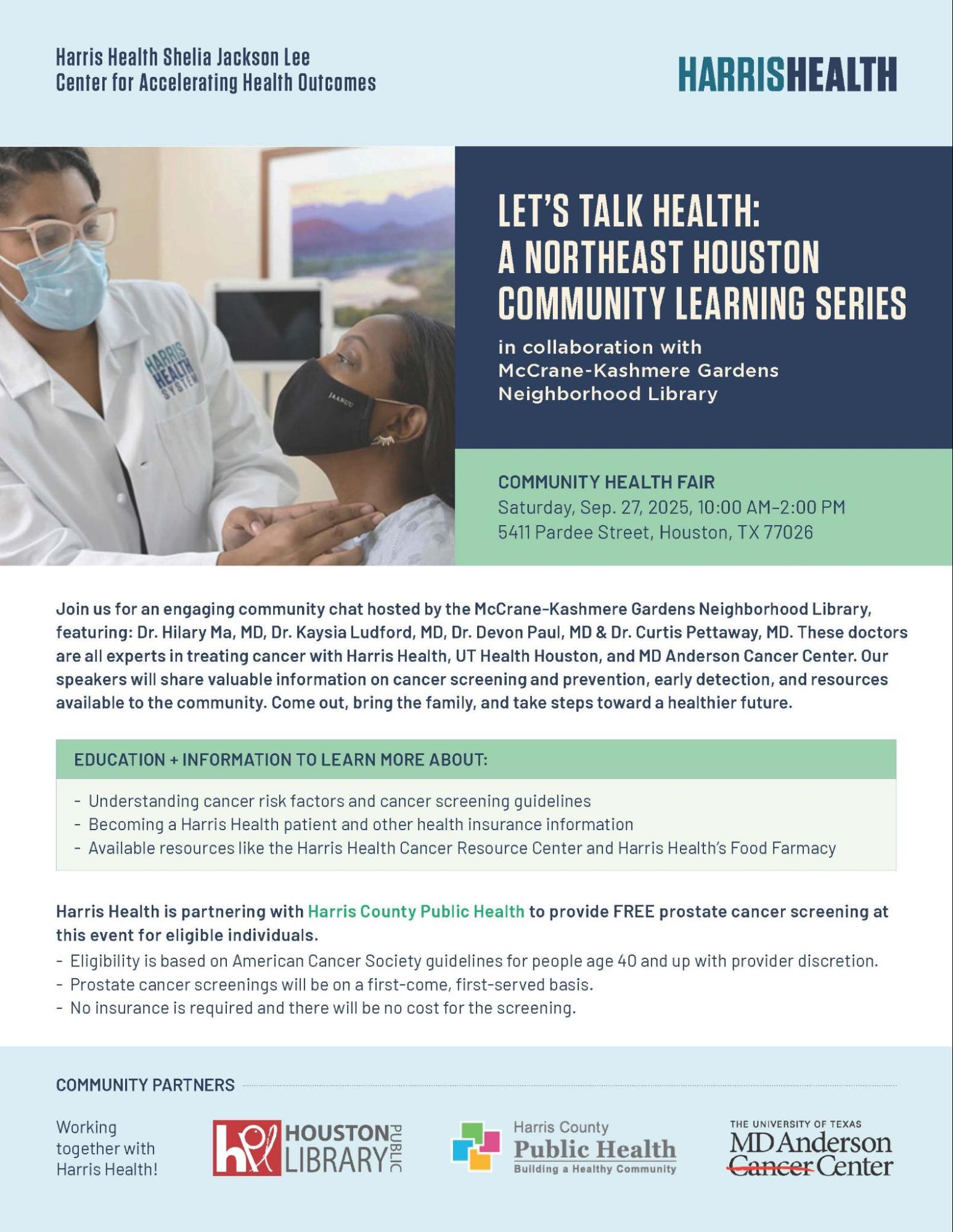 Harris Health is partnering with Harris County Public Health to provide FREE prostate cancer screening at this event for eligible individuals. Eligibility is based on American Cancer Society guidelines for people age 40 and up with provider discretion. Prostate cancer screenings will be on a first-come, first-served basis. No insurance is required and there will be no cost for the screening. |